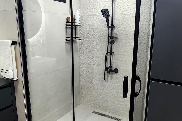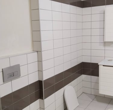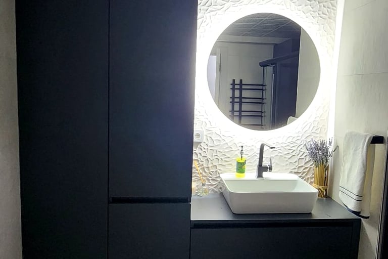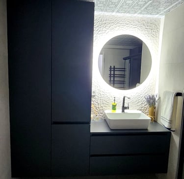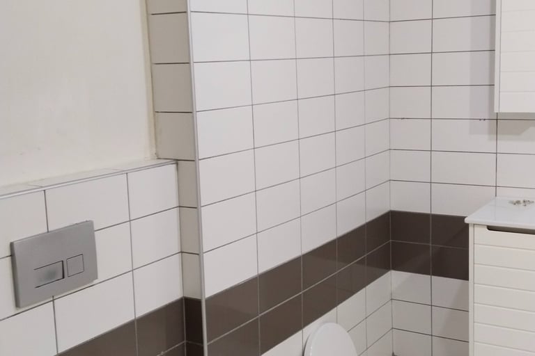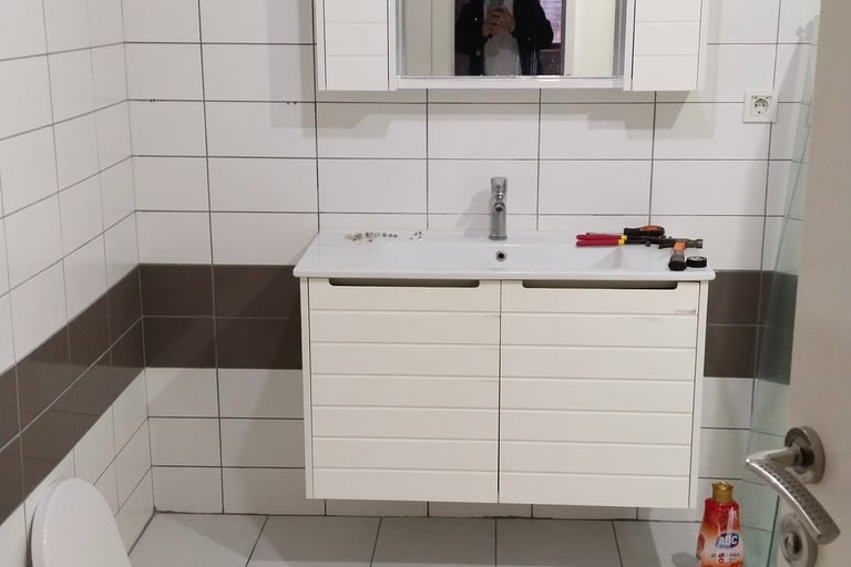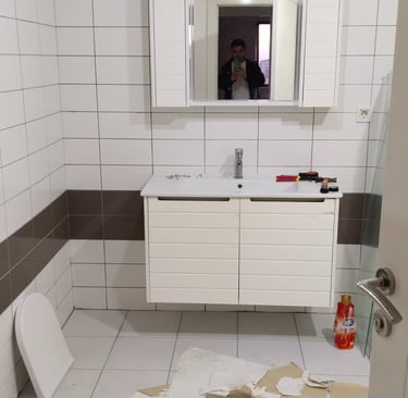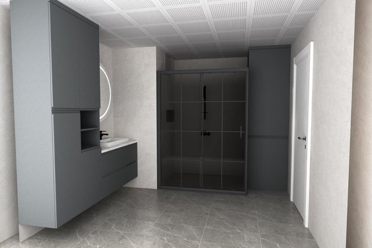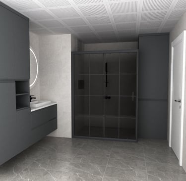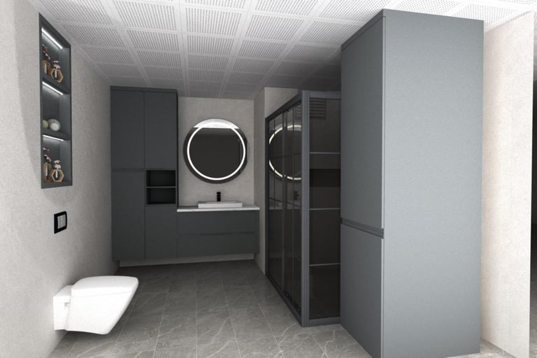 Müşteriyle çizimler üzerinde yapılacak her şeyi netleştirdikten sonra hızla inşaat aşamasına geçtik. İlk olarak seramikleri söktük, asma tavanı yaptık ve elektrik ile su altyapısını tamamladık. Ardından yeni seramikleri döşeyip alçı ve boya işlerini bitirdik. Süreci, dolapların montajını yaparak tamamladık.